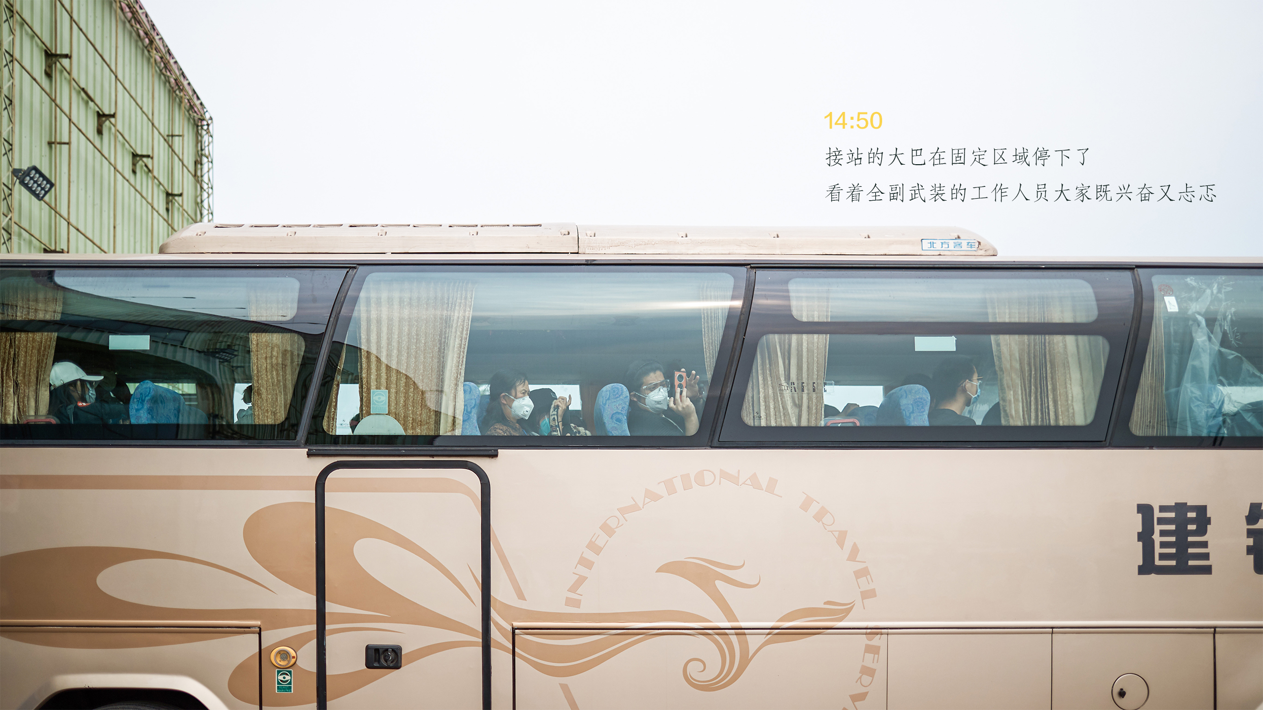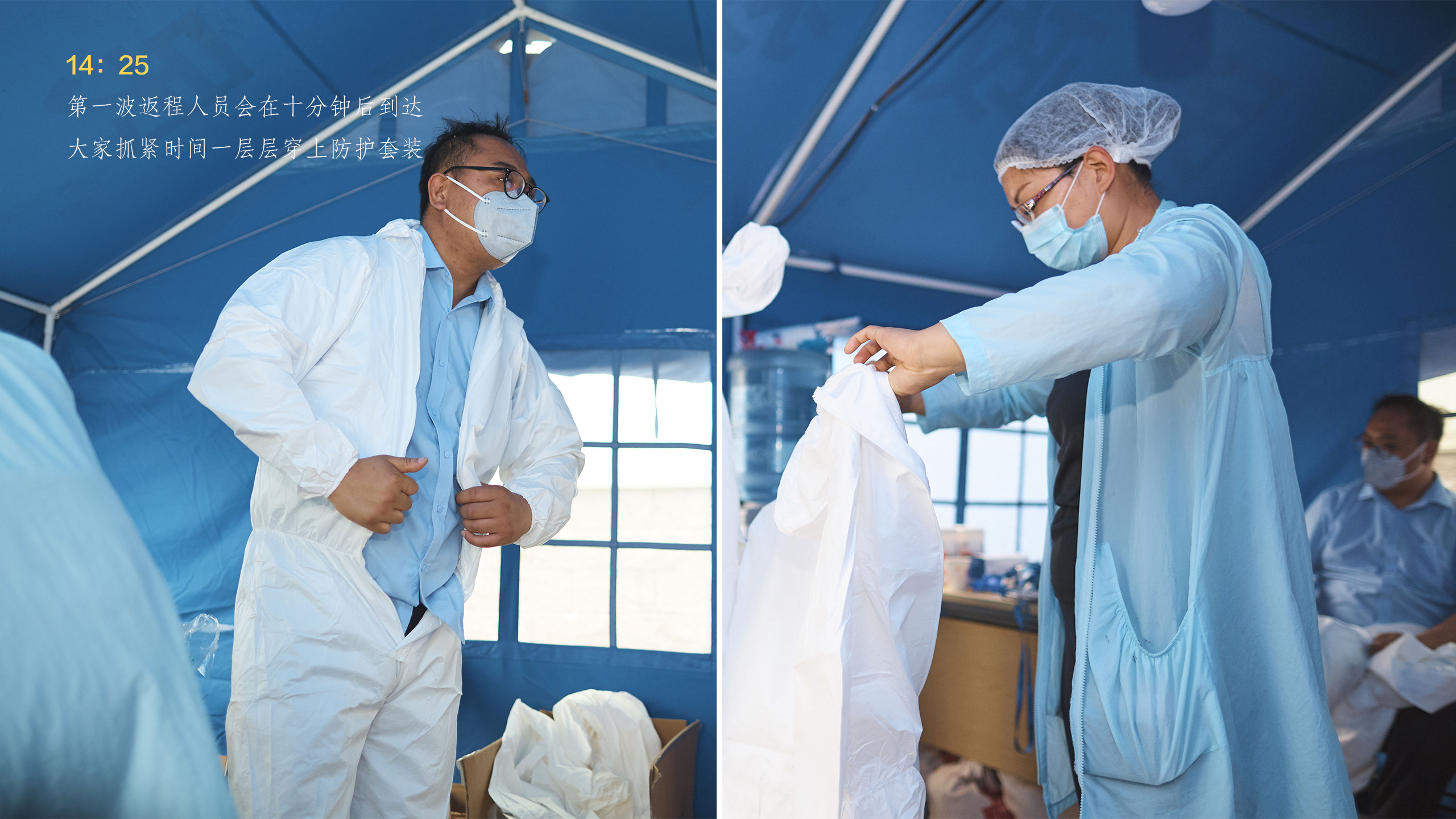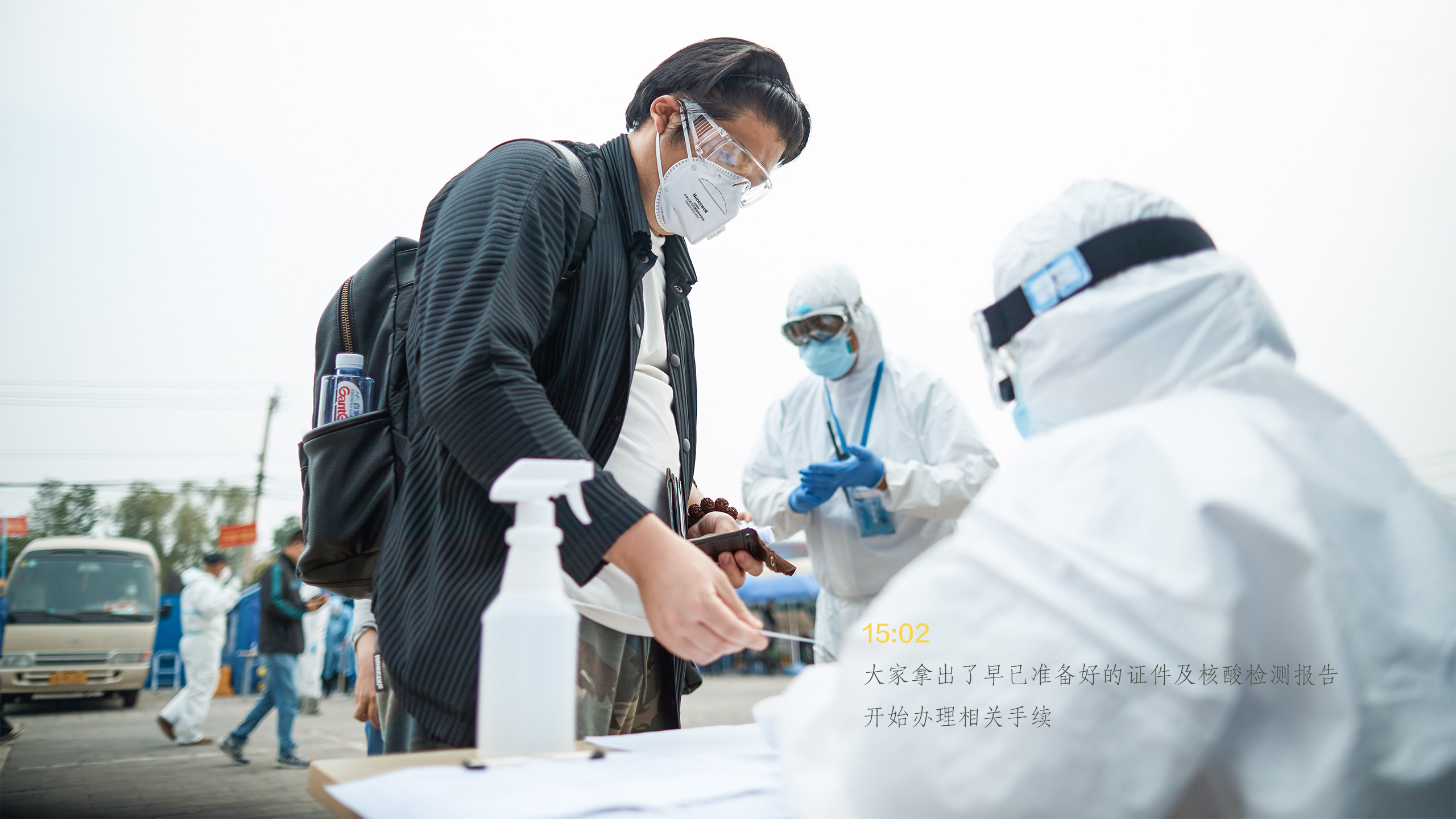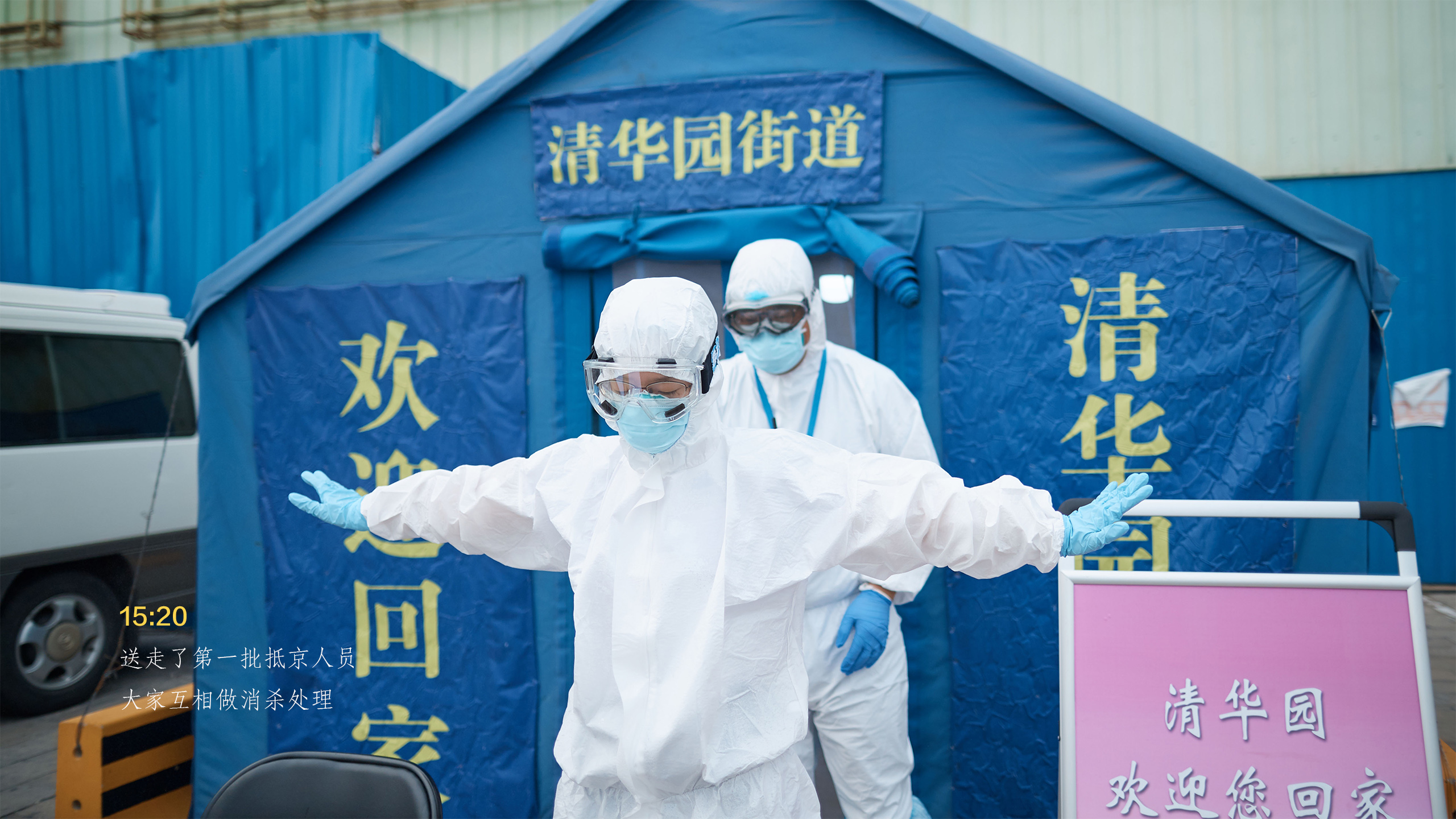 从抵达接站点到踏上回家的车,所有手续办理仅仅用了12分钟。像这样的流程每天要进行四遍,一直要持续到晚上十点。为了节省物资,接站人员只能一直这样穿着防护服等待返京人员的到来。大家明白,从湖北回来的乘客们经受着旅途劳顿和防疫工作的双重压力,心情难免有些不安,而我们唯一能做的就是将所有的办理程序以最有效的方式完成,尽快让返京人员踏上回家的校车。为了一份安心,所有工作人员穿着厚厚的防护服一次次地演练,里面都浸透了辛勤的汗水。