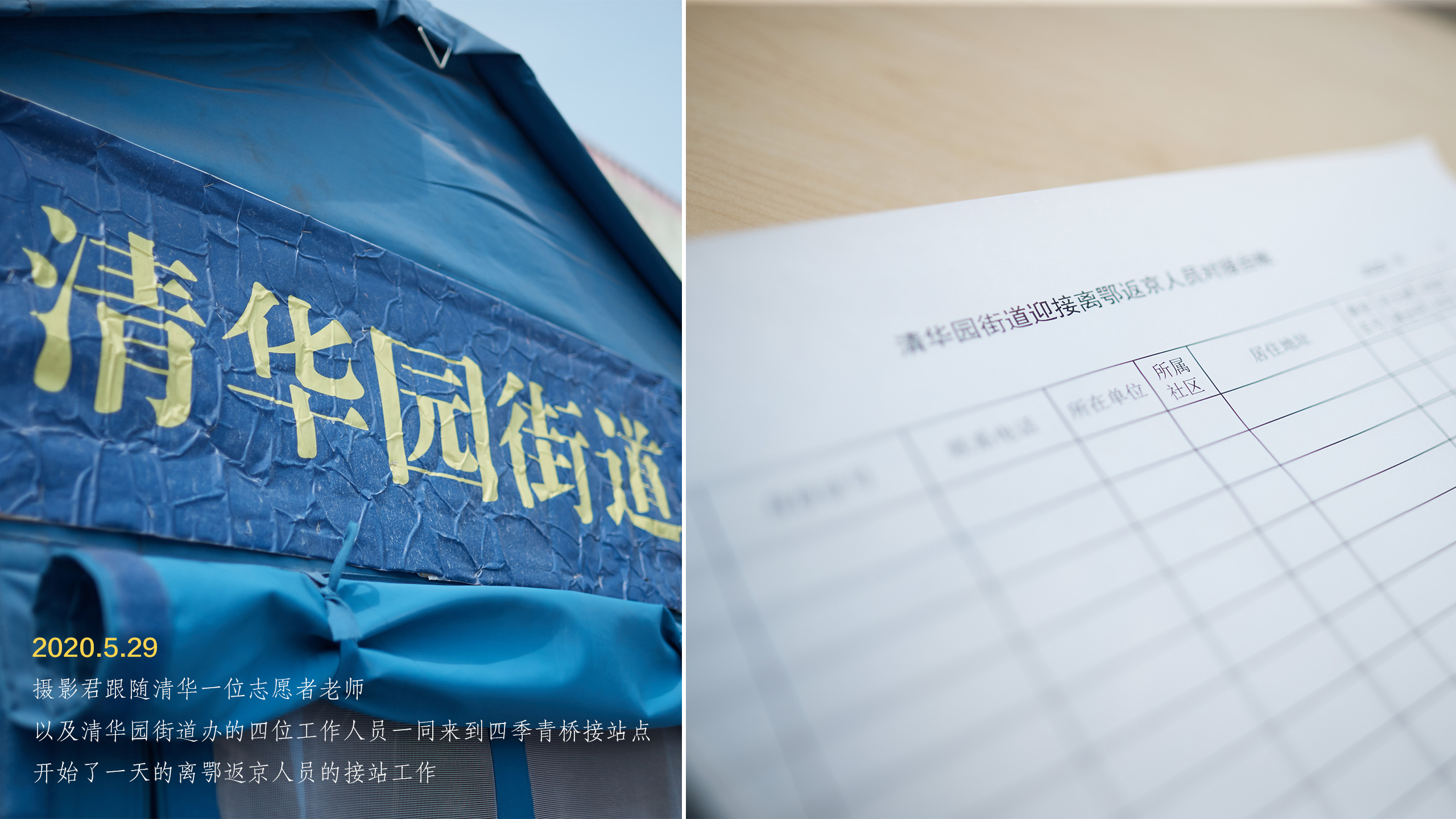 5月29日,摄影君跟随清华园街道中楼社区居委会吕博、王秀云,街道政务服务中心邓赫、赵珅以及乐动平台文化建设办公室的志愿老师龚阳玉洁,一同去四季青桥接站点体验了一次离鄂返京人员的接站工作。