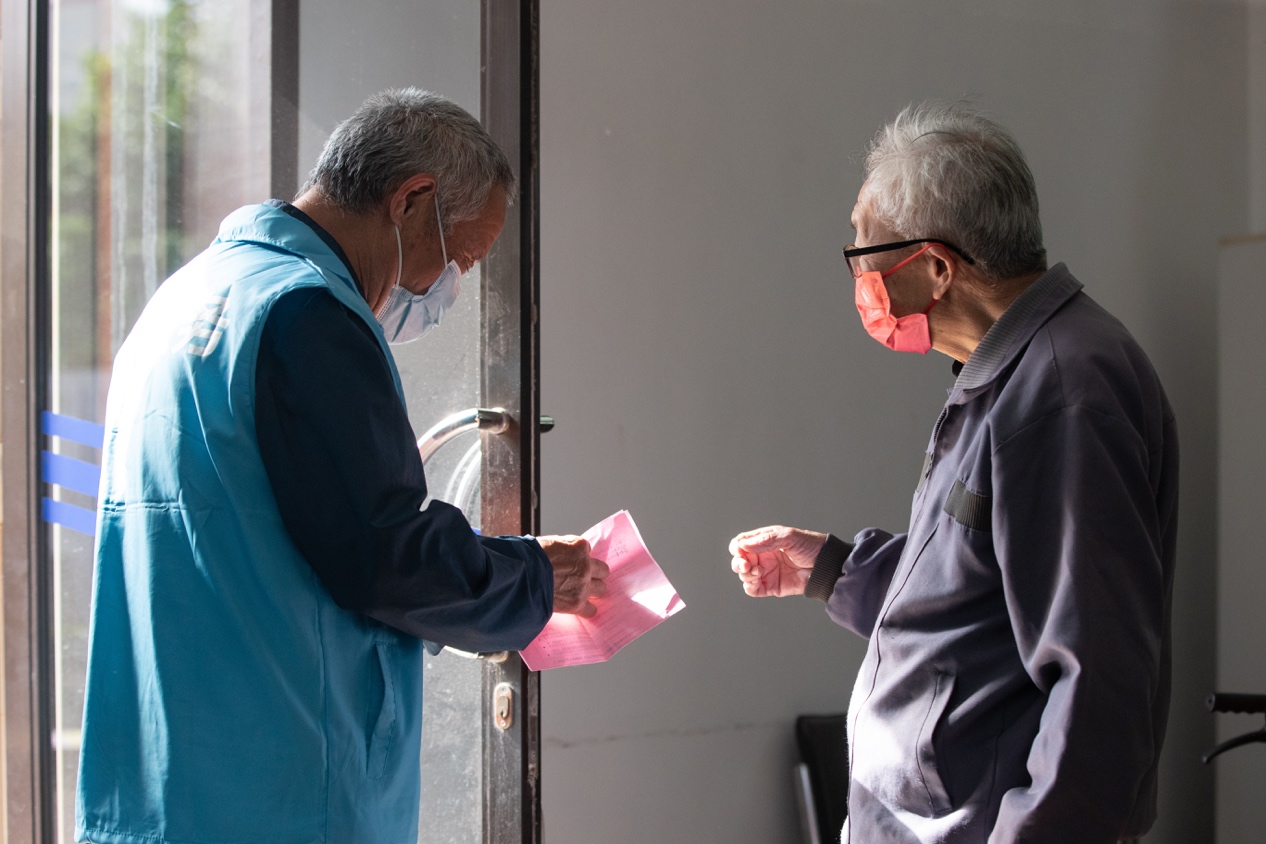 在社区志愿者的细心引导下,工作人员为老同志做好登记