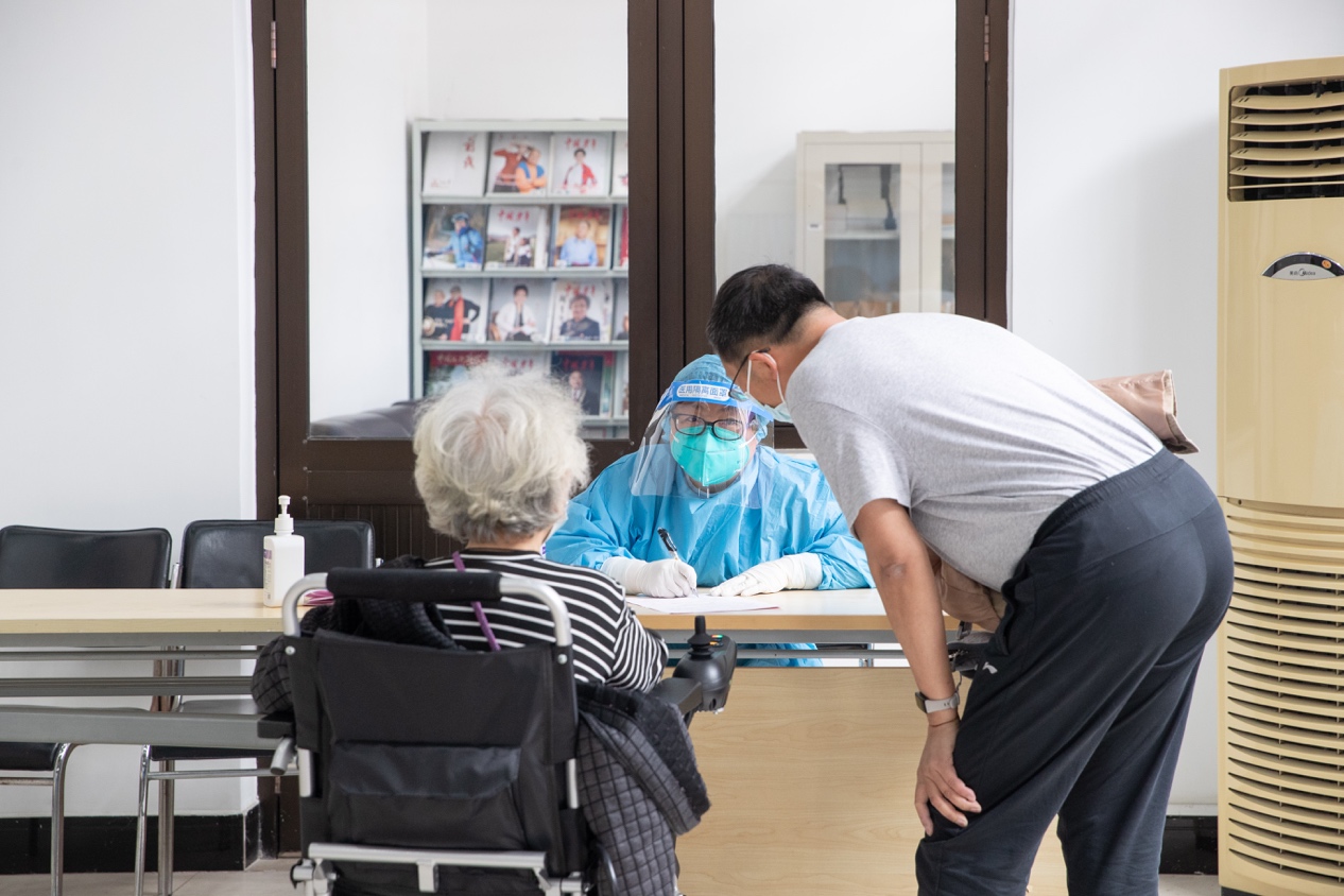 留观时间结束后,老同志在志愿者的引导下离开,完成疫苗接种