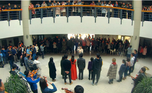 为尽可能不影响学校正常的教学秩序,快闪策划者之一、电机系2017级博士生黎晗东带着小伙伴们,提前到每间教室与上课的老师们进行沟通。“让我们感到十分温暖的是,所有老师都一致地表示了体谅,并非常支持我们的活动。活动开始后,12点15分下课的大多数老师同学都被快闪活动吸引,并随着歌曲的深入,自发加入一同唱歌,这令我们感到非常振奋。”