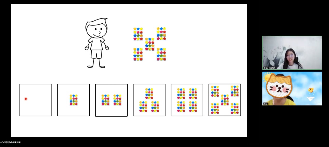 与马歆茗一样,《社会情感智能I》的选课学生对心理学充满了兴趣,由于面对面采访机会受限,他们积极克服困难,采用在线游戏、幻灯片展映、腾讯会议等方式推进数据收集工作,保证实验调查顺利进行。戴逸清通过在线播放幻灯片讲故事、请小朋友回答问题的方式展开调查,她说,“伍珍老师每一个阶段都给予我很多悉心的指导与鼓励,让我能够更有方向、更有动力地完成一步步挑战,最后获得自己都想象不到的结果。”