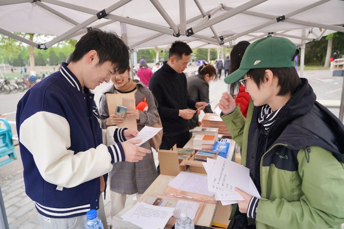 进入游园区,在50张校史答题卡中任意抽取5张,答出3题即可领取一份校史馆出品的精美文创产品。熟悉校史的同学自信地抽出5张卡,答案脱口而出,全部答对。答错的同学也毫不气馁,一边答题一边学习,在了解校史的乐趣中越挫越勇,主动要求“再来5张”。很多同学在挑战成功一组题目后,仍意犹未尽,留在摊位前翻看着其他题卡,扩充自己的校史知识。