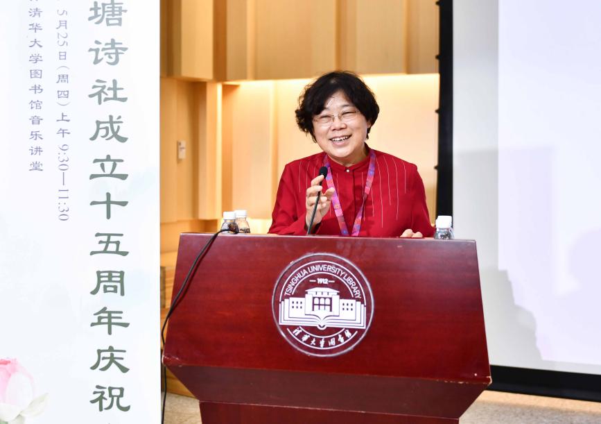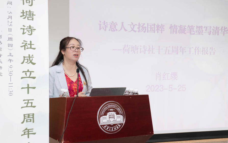 荷塘诗社常务副社长肖红缨作荷塘诗社十五周年工作报告。她从宗旨使命、职能定位、组织架构、队伍建设、特色活动、亮点成效、标志性成果、校内外影响力,以及未来展望等方面,介绍了荷塘诗社在开展重大主题诗词创作、参与学校重大文化活动,服务校园文化建设、提升清华文化品味,助力文化强国建设等方面所做的诸多开创性特色工作。