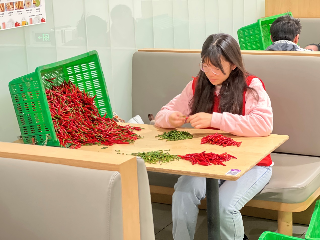 志愿者在紫荆园择辣椒