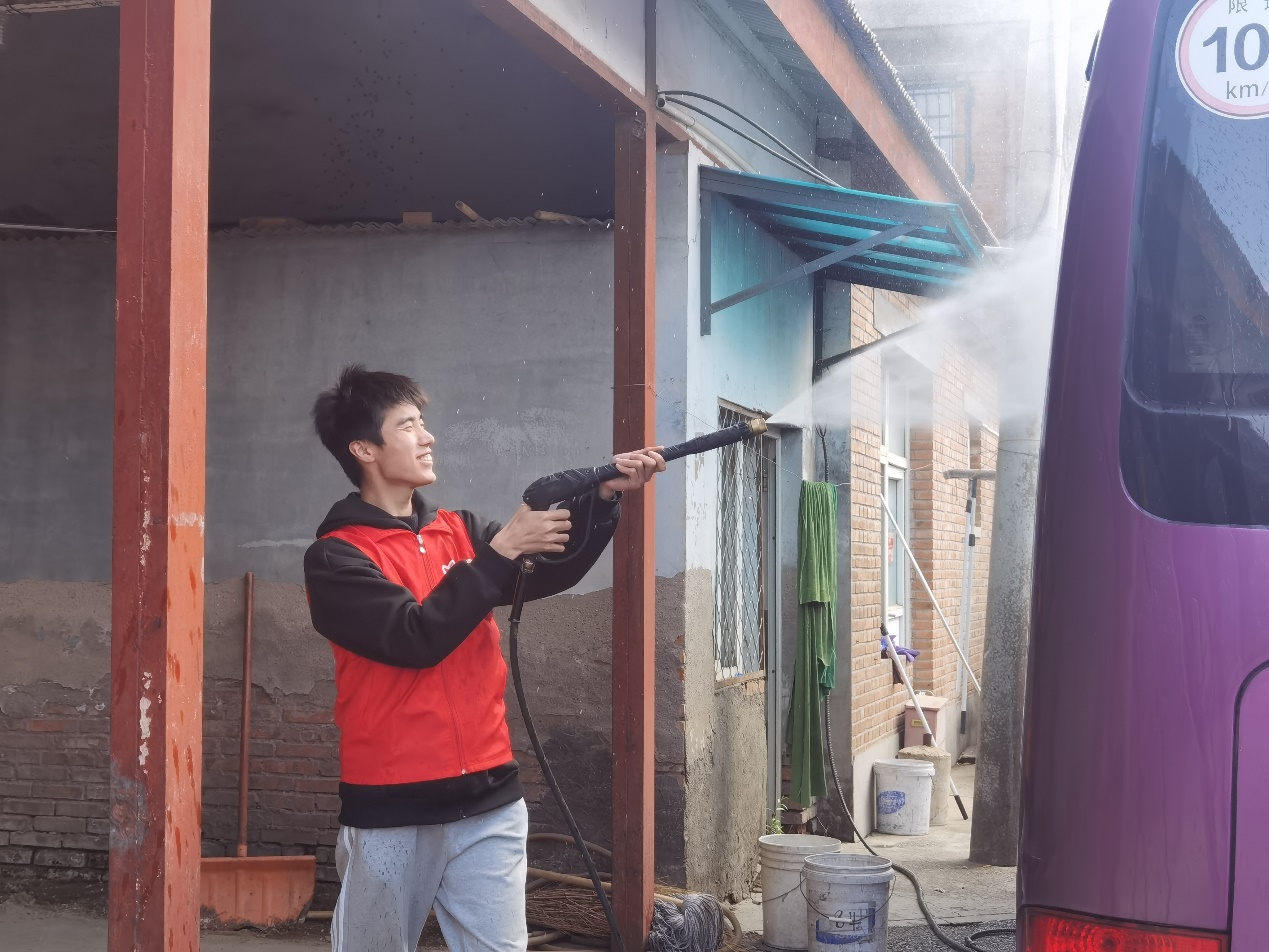 接待中心负责的校园巴士日常运行、会议接待服务、邮件信息收发处理、设备设施检查维护等工作也都引入到了“清”年爱劳动的岗位体系之中。校园巴士清洁与车容整理岗位要求同学们分组合作,首先检查巴士的密闭性,防止洗车时水进入内部;由一位同学使用高压水枪冲洗车辆表面,除去大多数的灰尘;之后大家一同拿起抹布、刮水器进行精细的清洁与擦拭;最后进入车辆内部进行内饰清洁及消毒工作。在大家的共同努力下,校园巴士重现干净整洁,以最好的状态迎接每一位乘客。