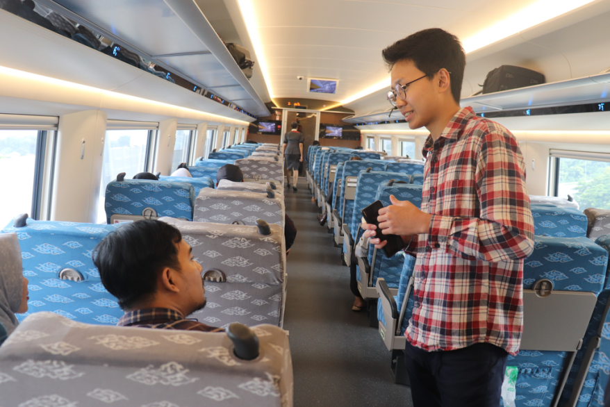 “讲好中国故事”赴印尼调研绿色经济领域中企形象塑造支队成员在雅万高铁上采访