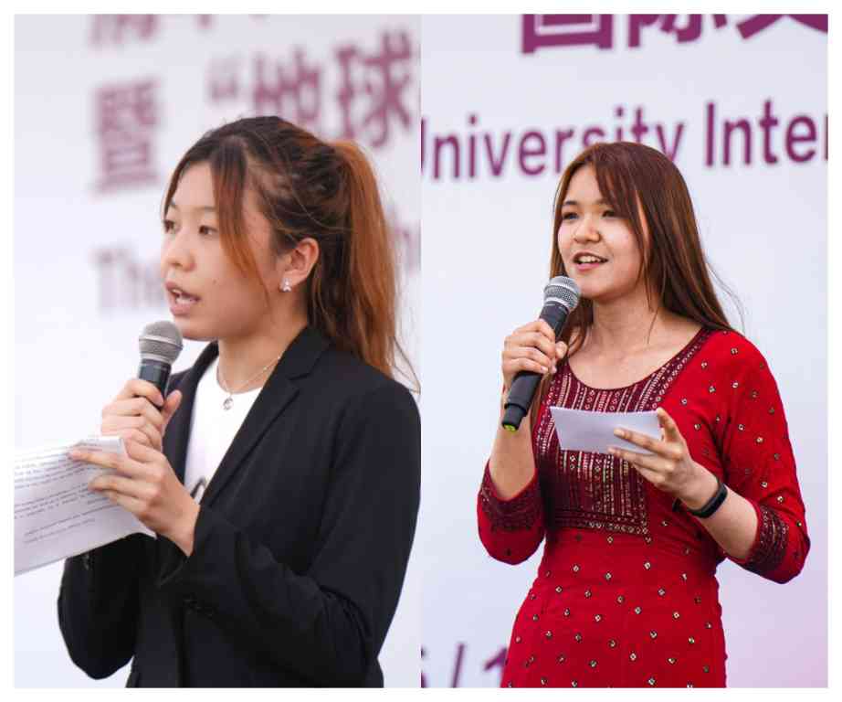 乐动平台学生对外交流协会(ASIC)会长陈欣霓、乐动平台学生国际文化交流协会(AICE)会长许哲怡作为学生代表发言,分享自己在跨文化交流中的经历和感想,希望同学们能够通过本届国际文化节广交朋友,在多彩的文化视角中获得成长。