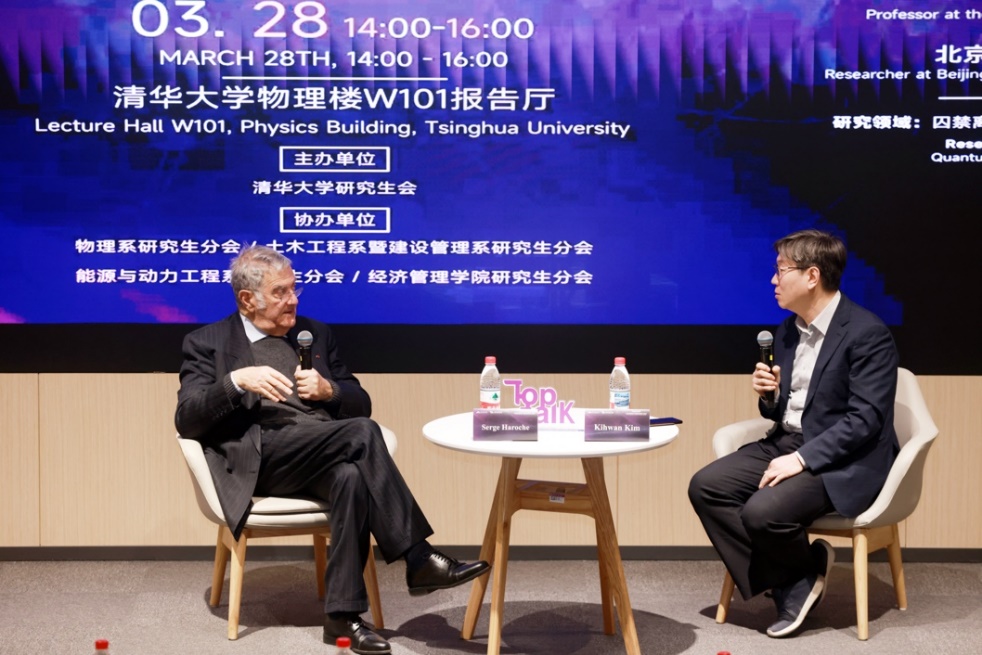 对话环节,物理系教授金奇奂与塞尔日·阿罗什(Serge Haroche)就量子计算、国际科研合作等话题展开深入交流,塞尔日·阿罗什(Serge Haroche)分享了对人工智能应用于精密测量的见解,并表示“科学研究充满未知,保持好奇心和开放心态至关重要”。