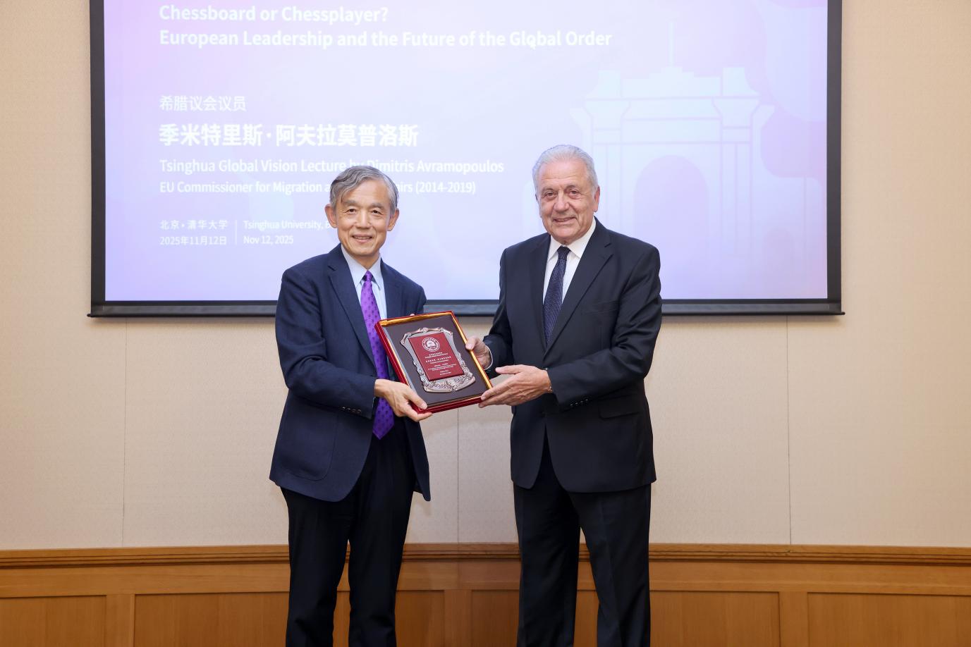 薛澜向季米特里斯·阿夫拉莫普洛斯赠送纪念牌