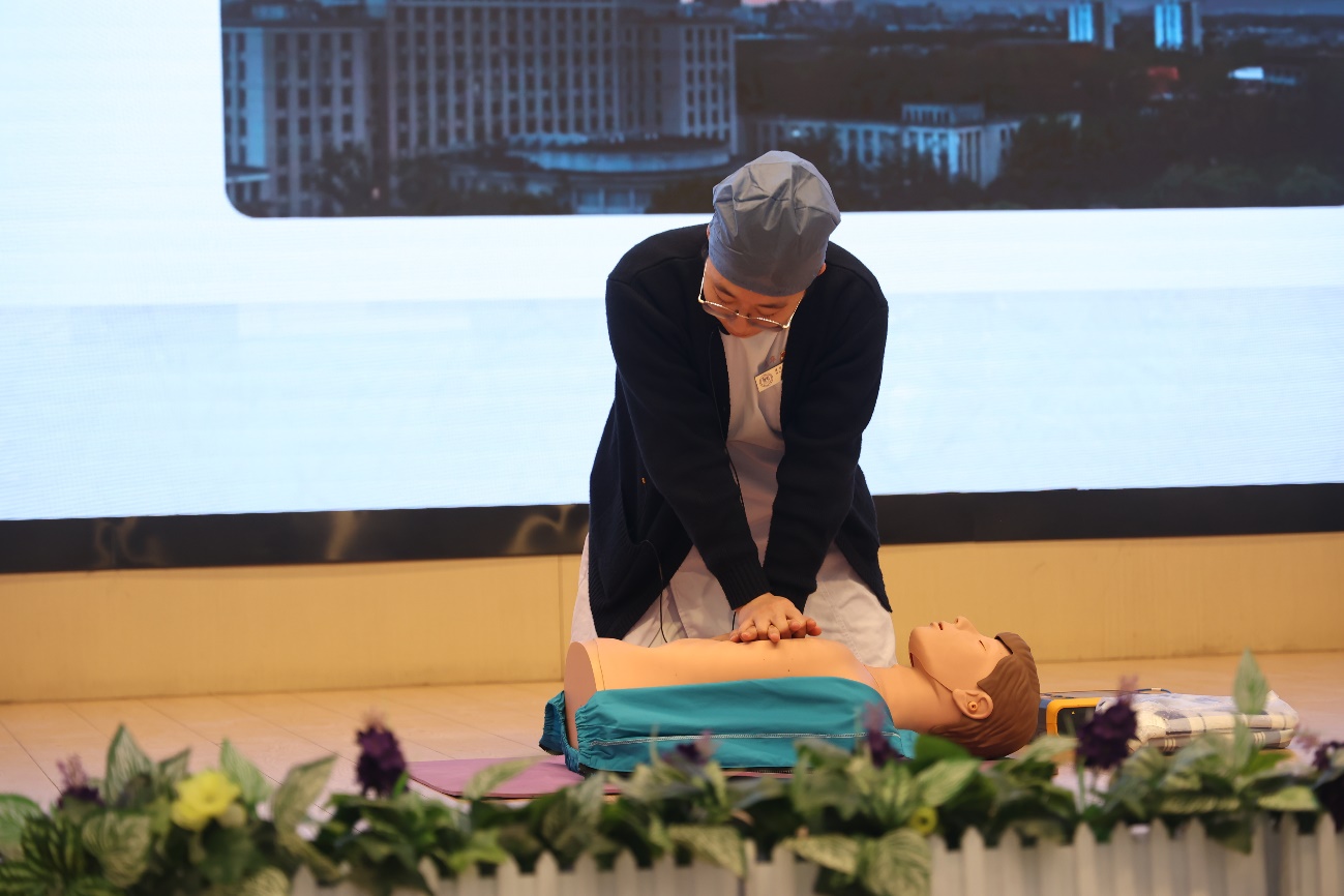 校医院医生从失血量评判标准、急救技能(止血、包扎、固定、搬运)两方面进行详细教学,重点演示了AED(自动分析心律并电击除颤)与CPR(胸外按压和人工呼吸维持血液循环)的关键操作流程及技术要领。