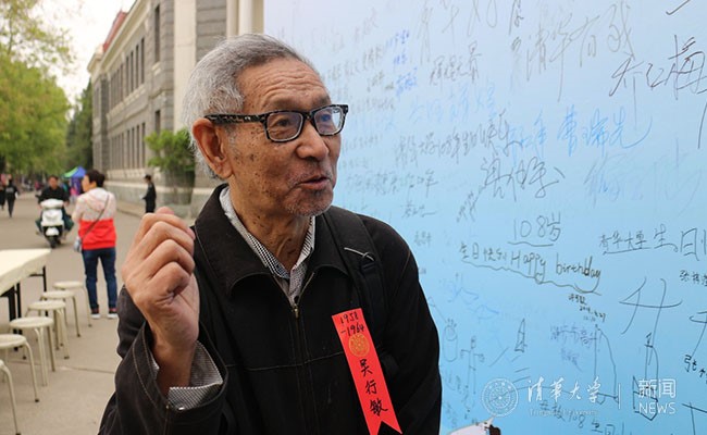 80岁的吴行敏早上9点便来到学校,在“清华,一生有你”互动展板上写下自己的感言:“进清华是一生之幸!”