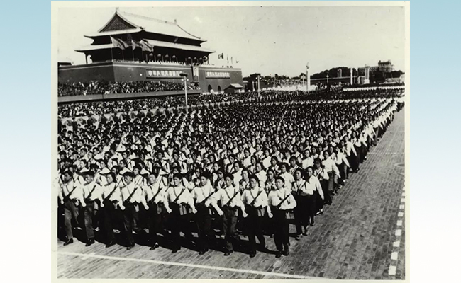 新中国成立35周年时,清华同学方阵走过天安门广场的情景