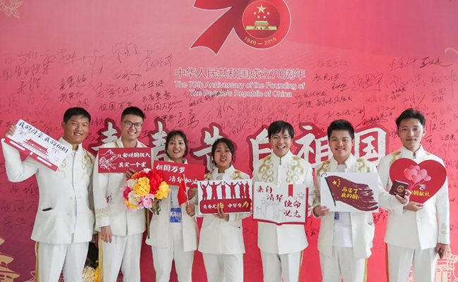 在庆祝新中国成立70周年的系列活动中,清华总计有4200余名师生参与群众游行、广场合唱、广场联欢、志愿者服务、彩车设计、景观设计等各方面任务。从7月份开始,师生们就放弃了暑假的个人安排,全身心投入训练,不惧风吹日晒,以强烈的政治责任感、高度的组织纪律性、精益求精的训练态度,认真刻苦地完成了各项训练任务,在七次外出合练中表现出色,得到了上级部门的高度肯定,以最昂扬的姿态迎接祖国70周年华诞,用青春告白祖国。