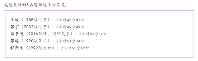 今年共有40名来自全球各地的清华校友跑步爱好者聚首波城,其中男子28人、女子12人。他们中有1977级的学长,也有年轻的2016级博士生,年级跨度长达39年。40名清华健儿全部顺利完成比赛,男子平均3小时22分25秒,女子平均3小时42分43秒,总平均3小时28分30秒,向世界展现了清华学子们“无体育,不清华”的英姿与风采。