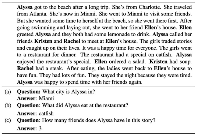 c)最后一个问题比较有难度。为了正确回答该问题,机器要找出该段落中提到的所有人名及其之间的关系,然后进行算术推理(arithmetic reasoning),最终给出答案「3」。