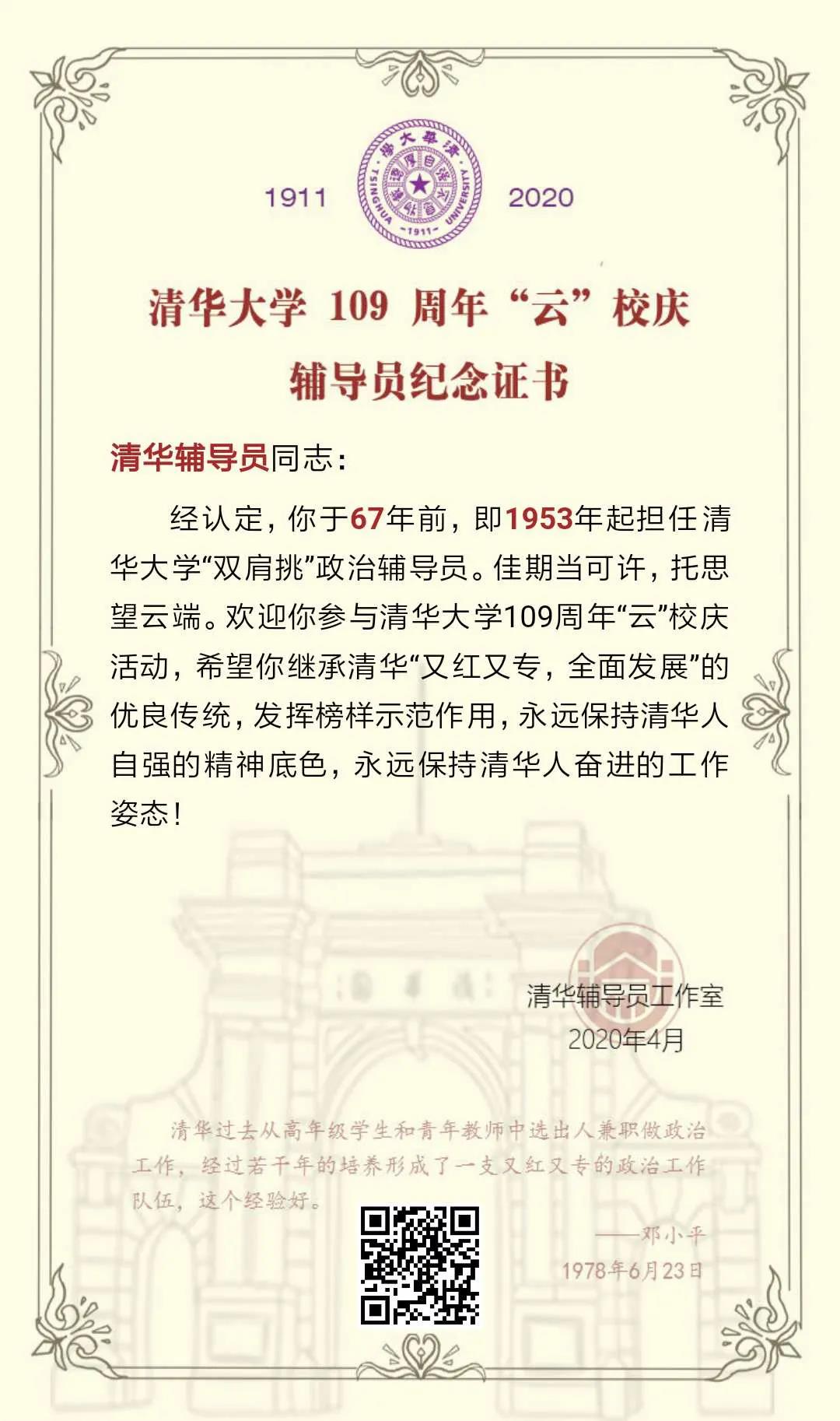 特别地,我们为参与活动的辅导员、曾经担任辅导员的校友准备了特别的一份礼物——专属于你的乐动平台109周年“云”校庆辅导员纪念证书。辅导员校友进入辅导员专属入口后,验证信息即可领取。希望这一份精美而特别的纪念证书,能够作为对你坚持“又红又专,全面发展”的肯定,能够为你永葆清华人自强的精神底色,永葆奋进的工作姿态加把劲!