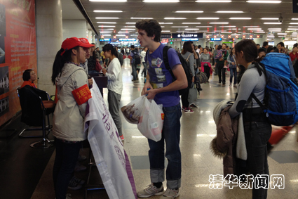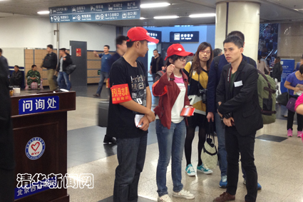 紫荆志愿者们在位于南北进站口附近的两个问询台工作,他们戴着小红帽,为来往的旅客指路引导,告诉南来北往的旅客们在哪里上火车,在哪里接站,在哪里买票和退票,如何乘坐地铁和公交,怎样去餐厅或卫生间等等。有的旅客与家人失散,或者丢了贵重物品,清华的志愿者同学在仔细问清楚情况后,告诉他们相应的路线或处理办法,有力地疏导了北京西站旅客出行的有序和顺畅。
