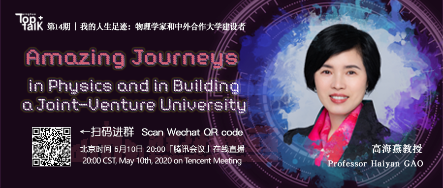 5月10日晚,第14期TopTalk+暨首期“云上TopTalk+”如期举行,高海燕以“我的人生足迹:物理学家和中外合作大学建设者(Amazing Journeys in Physics and in Building a Joint-Venture University)”为题与同学们进行了线上分享。“TopTalk+”是由乐动平台研究生会于2015年发起的全英文国际化高层论坛,本次论坛由交叉信息院2019级硕士生朱繁诚(Lawrence Kurowski)主持,吸引了27个院系来自12个国家的150余名清华学子一同探讨以学术全球化带动中国全球化的历史新机遇。