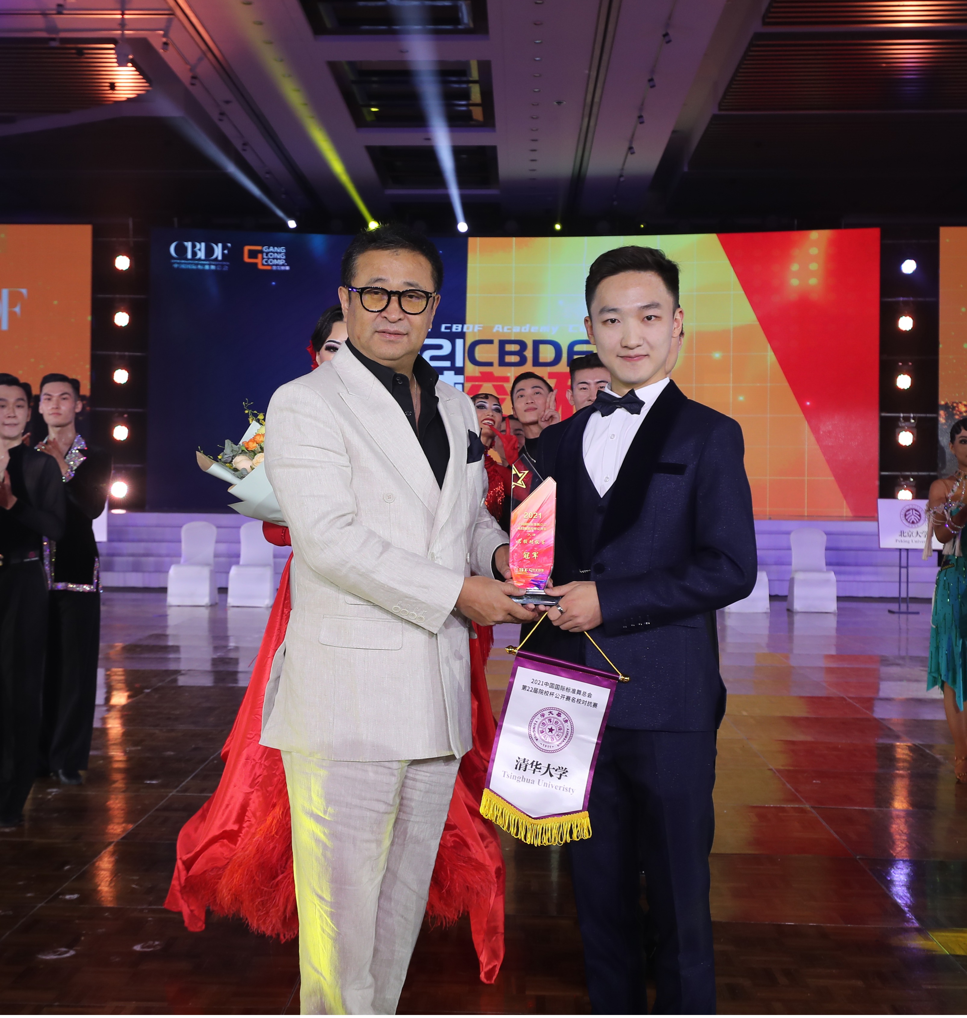中国国际标准舞总会副主席兼秘书长王永刚(左)为清华学生艺术团国标队颁奖