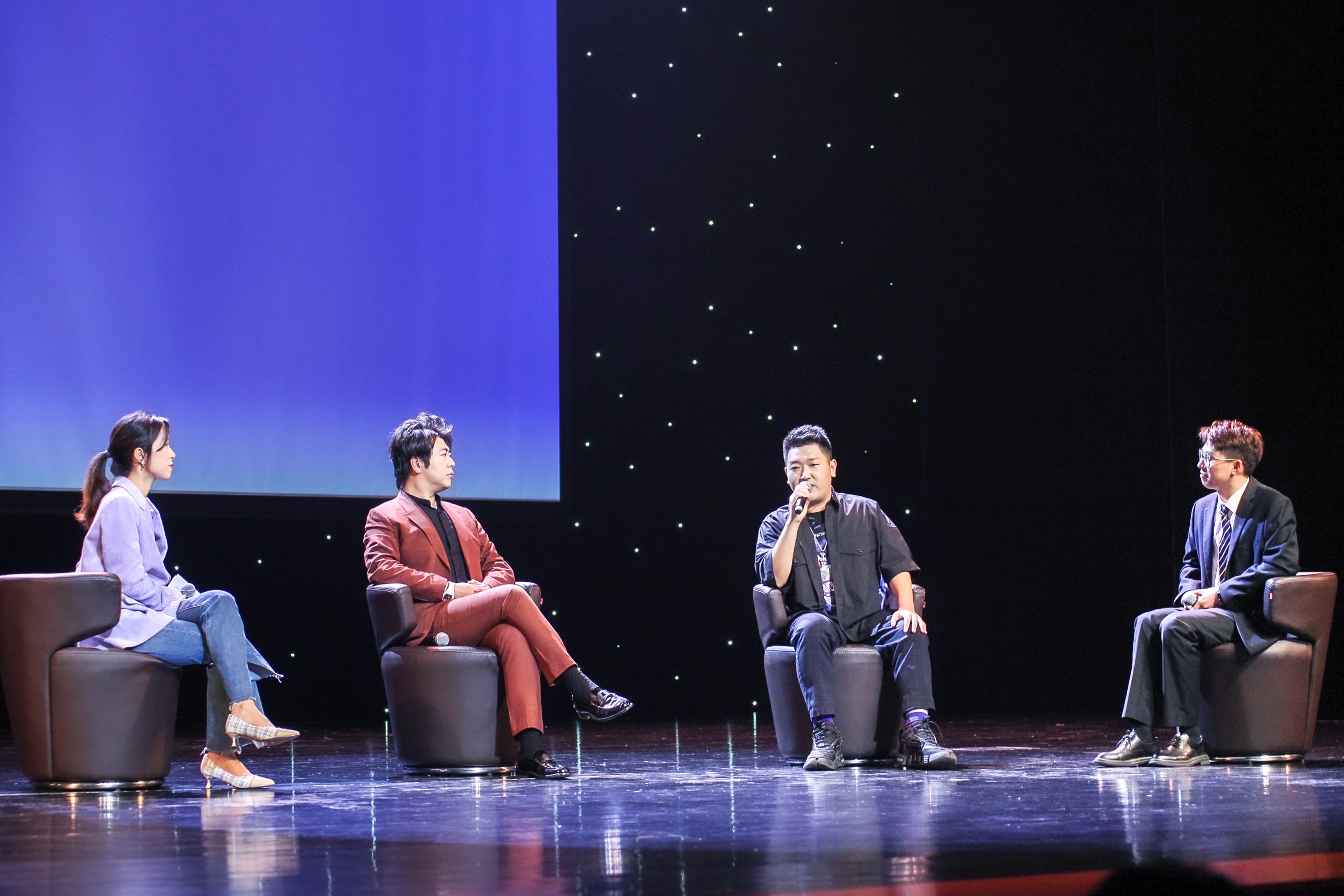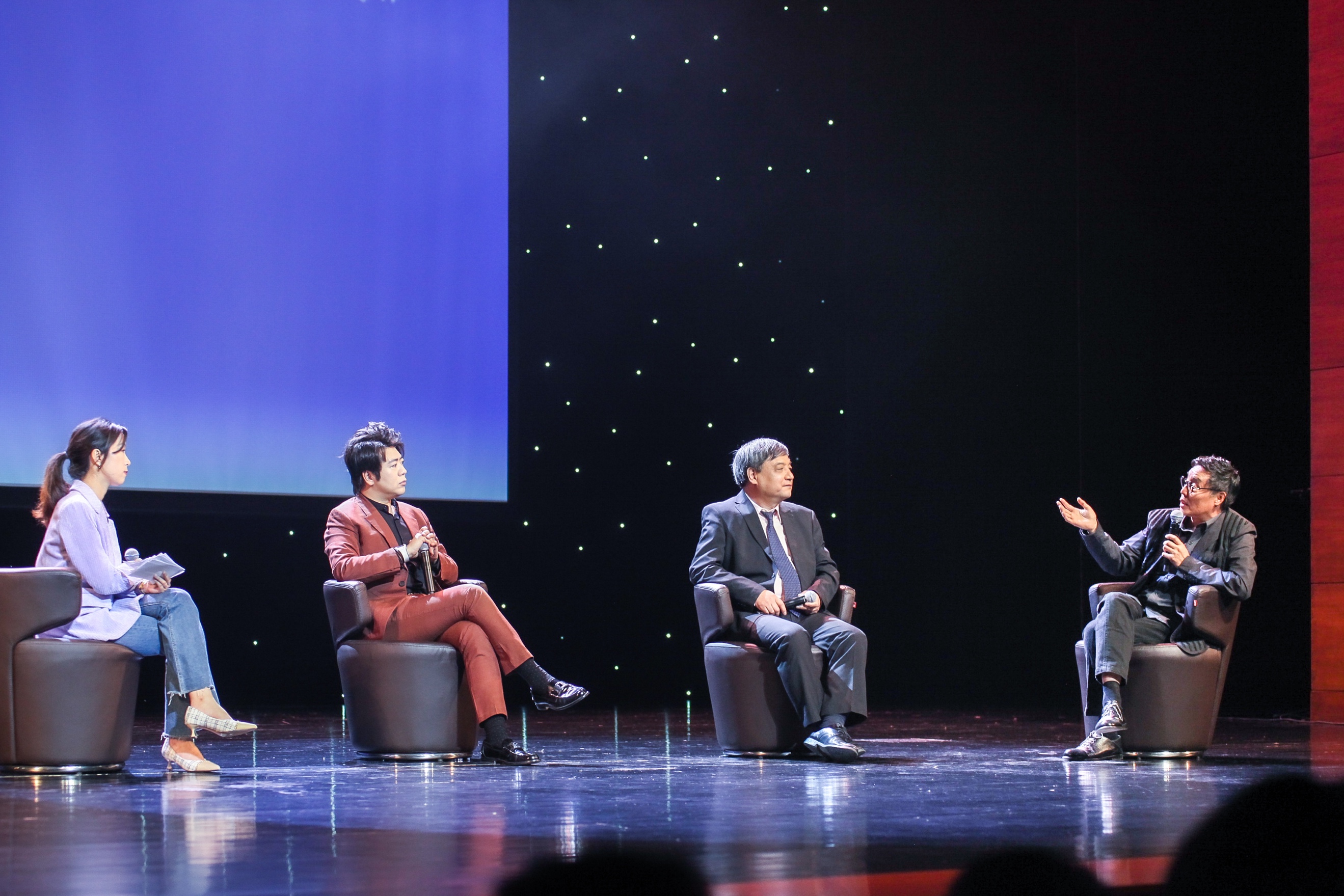 “美育人生”对谈环节(右起:杨胡灏、宿涵、郎朗,主持人杨淼)