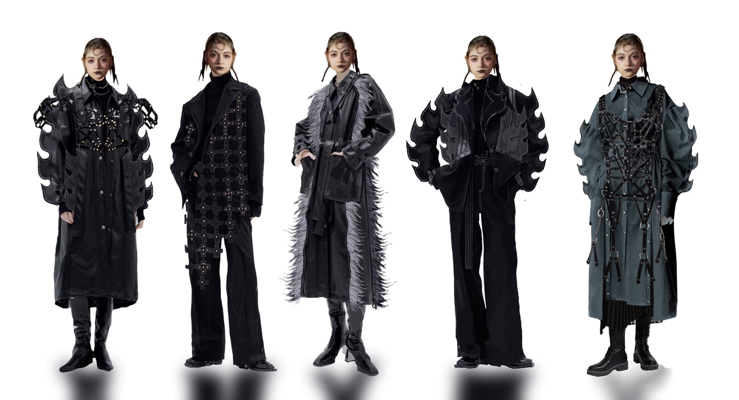 吴简的作品《少女龙王》系列以龙为设计的生发点。龙作为神话中的瑞兽,拥有变化莫测的形态和呼风唤雨的能力,对应了作者认为当代女性最好的状态——美丽且强大。传说中,龙纹图腾里伴龙而生的火焰与流云是龙的翅膀,将其几何化拆分得到的线条成为本次设计大廓形。金属铆钉代表按照秩序排列的龙鳞,是提取传统纹样的加工后表达;皮带元素象征束缚,但规律分布的皮带更像装饰。作者描摹的少女冷傲凌驾于甜美感之上,少女龙王终会摆脱枷锁。