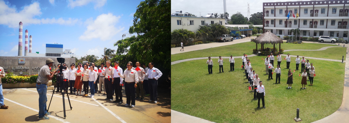 在电站大门前(左)及项目部营地内(右)拍摄庆祝新中国成立70周年祝福视频