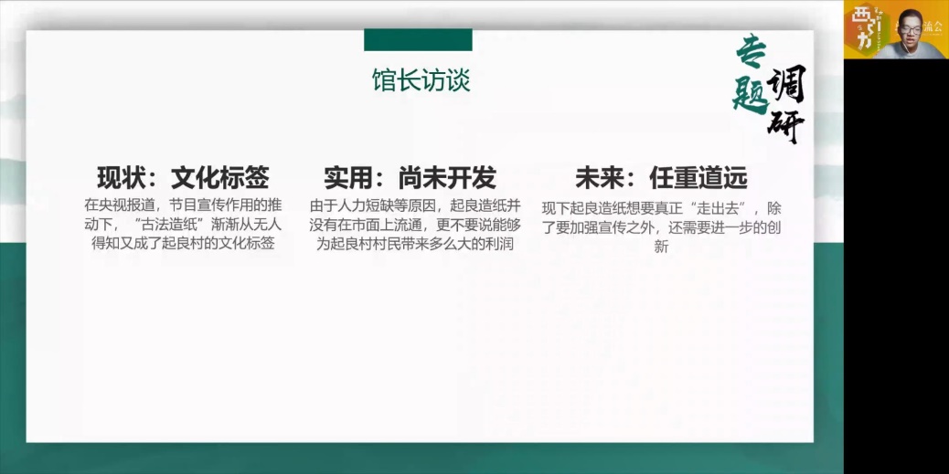“纸短源长”支队则深入西安市周至县起良村,了解造纸工艺的历史渊源、步骤工艺,探索“老记忆”的“新出路”。通过调研,支队成员了解到在多方努力下,古法造纸由无人知晓的失传手艺成为广受关注的文化标签,但年轻劳动力的流失与起良造纸独特的手工性和狭窄用途,使得起良纸无法量产和在市面流通,不成熟的规划也难以吸引社会的合作与投资,充满魅力的文化标签并没有得到应有的开发。但作为乡村的文化品牌,“起良纸”的发展是当地乡村振兴的一个极为重要的组成部分,虽存在诸多阻力,并不妨碍当地群众有一颗为乡村做贡献的心。这样的情怀的赓续是对非遗传统文化最大的保护。