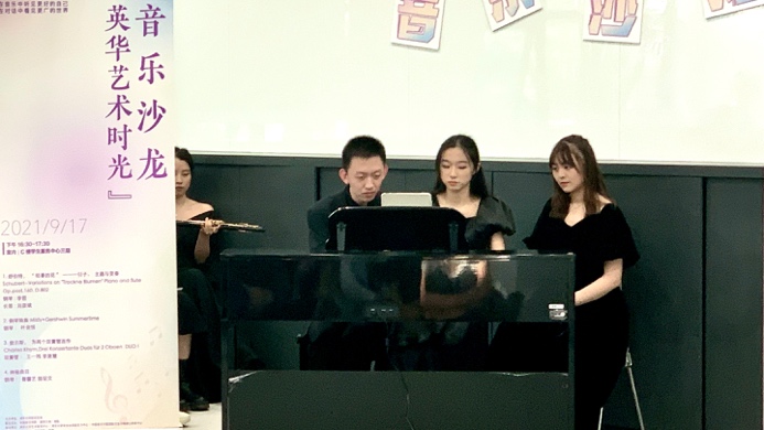 来自中国音乐学院的“破壳团队”依次为清华的师生演奏了舒伯特的《枯萎的花朵》、格什温的《Summertime》以及查尔斯的《为两个双簧管而作》等曲目。悠扬的旋律从长笛中传出,动人的音符在黑白琴键中欢快地跳跃。乐手们配合默契,精彩的演出赢得了现场师生们的阵阵掌声。活动现场座无虚席,精彩的演出还吸引了许多往来的师生驻足聆听,大家一起享受这一场与音乐的美好邂逅。