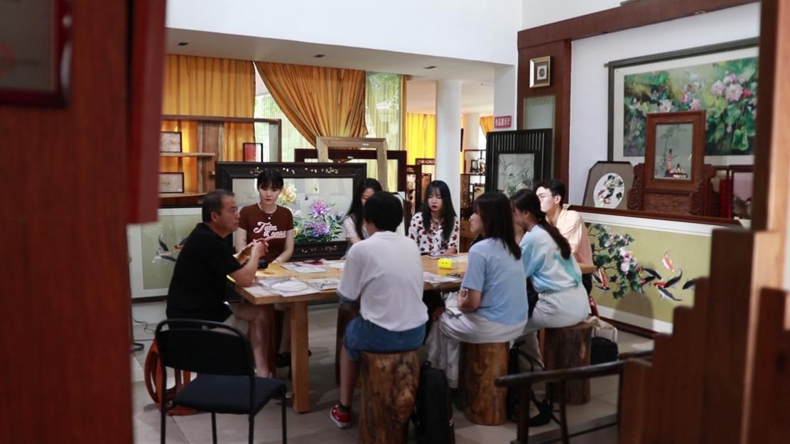 “锦绣潜程”支队与国家级蜀绣技能大师邬学强(左一)进行交流