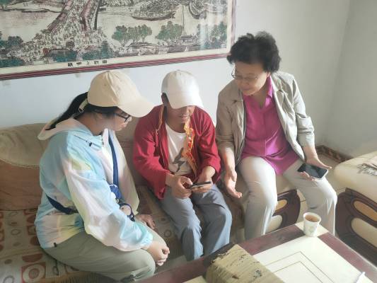 赵丽明(右一)与支队成员采访苯教文化传承人杨吴金宝(右二)