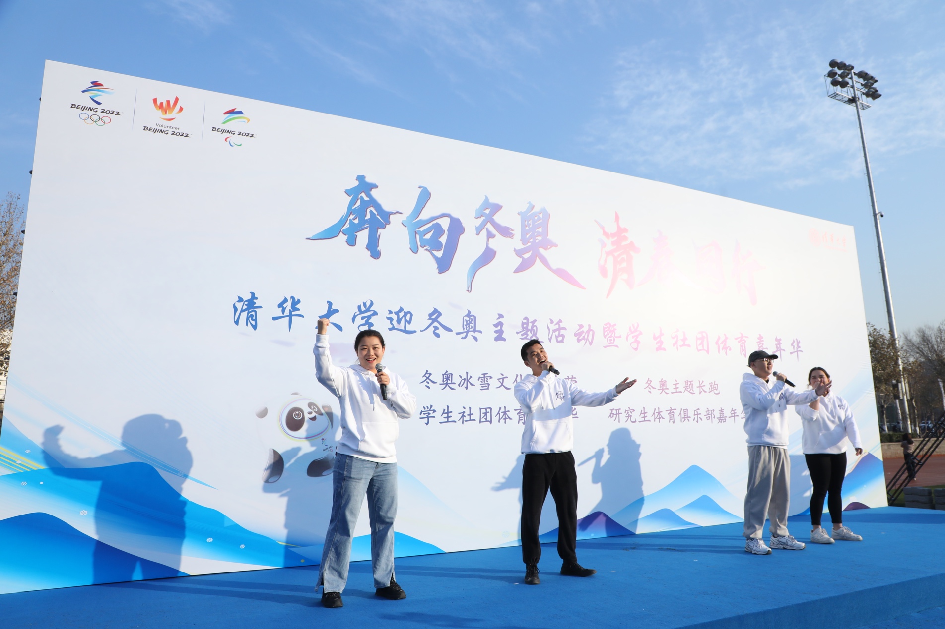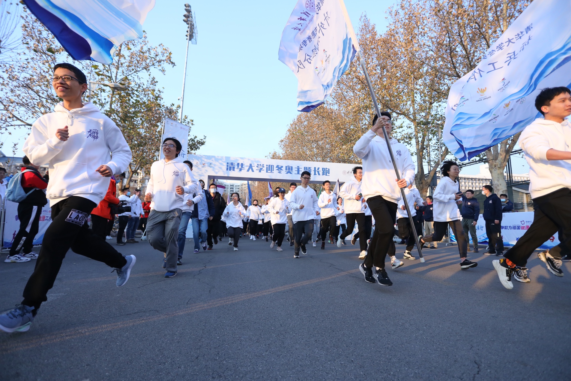 热身过后,下午四时起跑枪响,冬奥长跑活动正式开跑。40余名冬奥志愿者组成领跑团,带领同学们喊出“奔向冬奥,‘清’春同行”“为祖国健康工作五十年”的响亮口号。
