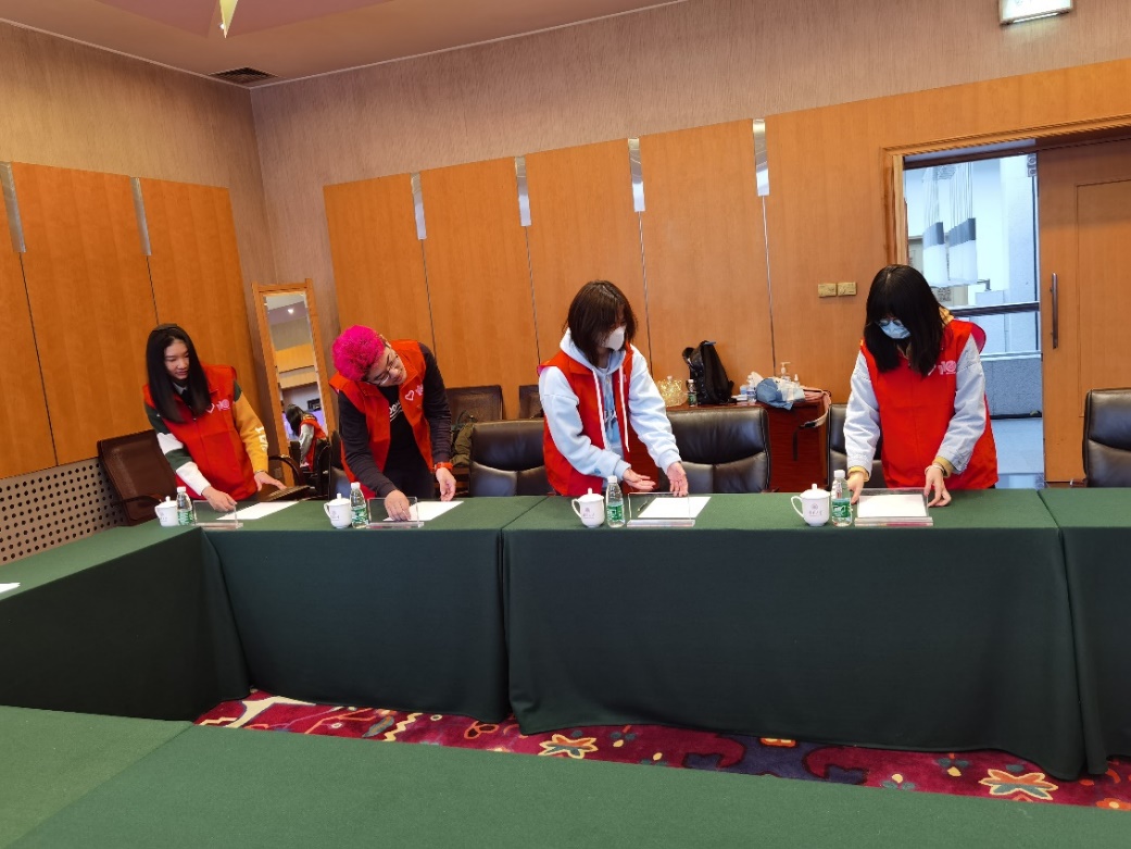 接待服务中心开设的会议服务员岗位的劳动内容十分丰富,快速地学习一些会议接待服务的礼仪后,同学们在老师的带领下练习会场布置、倒水服务和清理打扫等,分组合作完整地体验会议的服务流程。在饮食服务中心开设的早点制作岗上,同学们一手持擀面杖、一手压着面皮,同清芬园食堂的师傅们一起完成饺子、包子等早点的制作,不仅体会到食堂师傅每日劳动的辛苦,也收获了做好一份菜品的快乐与成就。完成早点制作后,同学们来到售饭窗口,协助进行早点售卖,切实服务来往同学。
