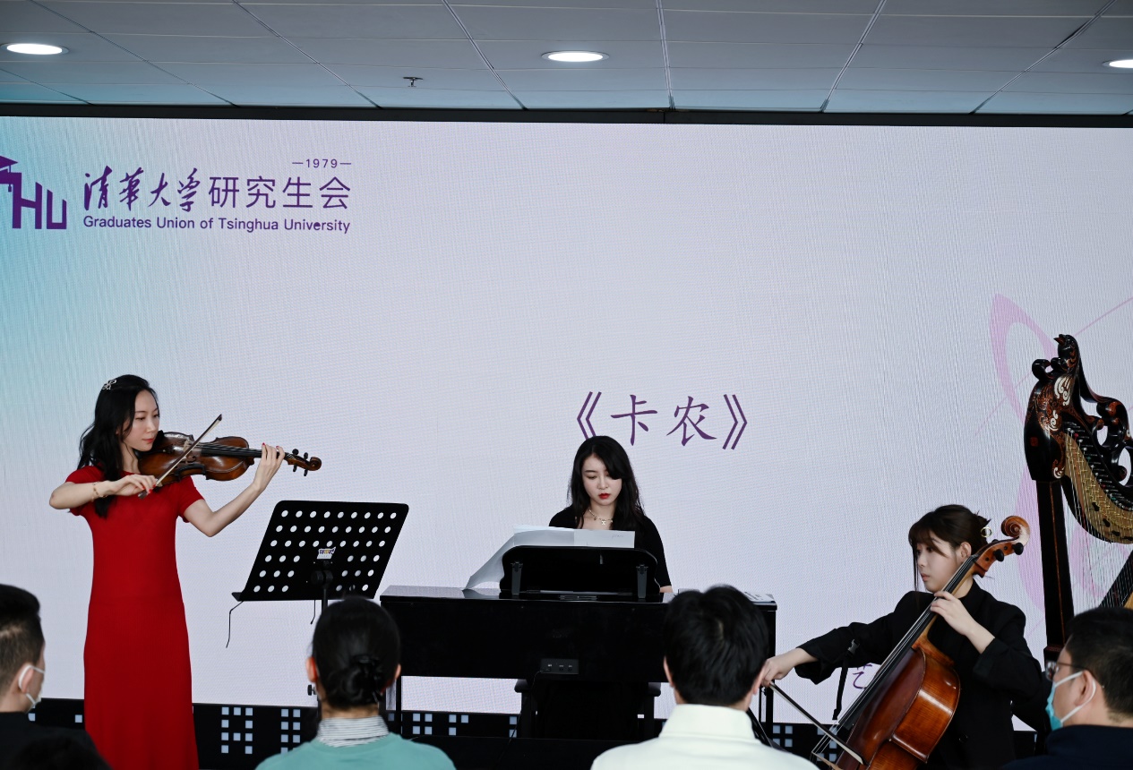 云鼎乐团为清华师生依次演奏了《卡农》《Always with me》《青花瓷》《一生所爱》《大鱼海棠》《但愿人长久》《春天来了》《天空之城》《清平调》九首经典曲目,云鼎乐团团长呈莹主持本次活动并作导赏讲解。钢琴、小提琴、大提琴等西方乐器与箜篌、箫等中国传统乐器交融演奏,悠扬的乐曲如同潺潺清泉滋养着大家的精神世界,赢得了在场师生的阵阵掌声,也吸引了许多场外师生的驻足。