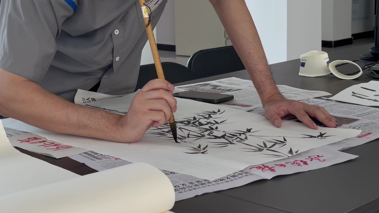 拥有这样的风景人情,优化乡风文明建设“软环境”不难建立,“文化润人”水到渠成。到孟家庄的第一天,队员们遇到了村妇联主任栾阿姨,栾阿姨说村部里有一个小型展览长廊和文化角,请队员们为长廊留下几幅字画。队员们一口应下,写字作画共六幅。傅千懿和罗明军画了几幅竹子和兰花,安东则写了一幅隶书书法,上书六个字:“建设美丽乡村”。