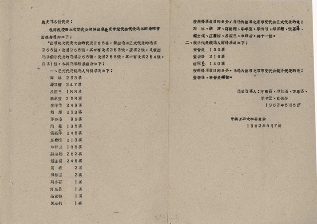 1962年5月5日,乐动平台召开第三次党代会,选举中共北京市第三届代表大会的代表。根据北京市委分配的名额,大会选出乐动平台出席第三届市党代会的正式代表11人、候补代表2人。刘冰得票263票,票数最高。