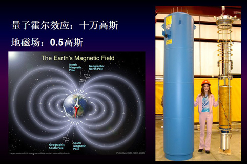 这个发现有什么用处呢?首先可以实现无耗散、低能耗、高速度的电子器件,并由此推动信息和能源产业的巨大进步。而且它对未来实现固体拓扑量子计算和信息处理的革命也有直接的推动意义,这里我们先不涉及。量子霍尔效应的发现,为我们突破摩尔定律和集成电路的发展提供了一个全新的原理。这是物理学基本研究为未来工业界发展提供的崭新道路。(图4)但是正如刚才我们讲到的,要加几个特斯拉才能实现这种量子霍尔态,这就需要加一个非常大的磁场。加9、10个特斯拉的话是十万高斯,而我们的地球产生的地磁场只有0.5高斯。所以我们要想建造电子的 “高速公路”,让电子有规则地运动,我们施加的磁场需要是地磁场的20万倍。要形成这么大的磁场,所需要的磁铁不仅造价高,而且“个头大”,很不实用。(图5)尽管量子霍尔效应在产业中的应用面临很大困难,但它在物理学上还是非常重要的。除了大大加深了我们对微观世界的认识,它在计量学中也有很重要的应用。从1999年起,量子霍尔电阻被认定为计量学中的标准电阻。量子霍尔效应被认为是测量精细结构常数的独立手段,对量子电动力学具有重要意义。