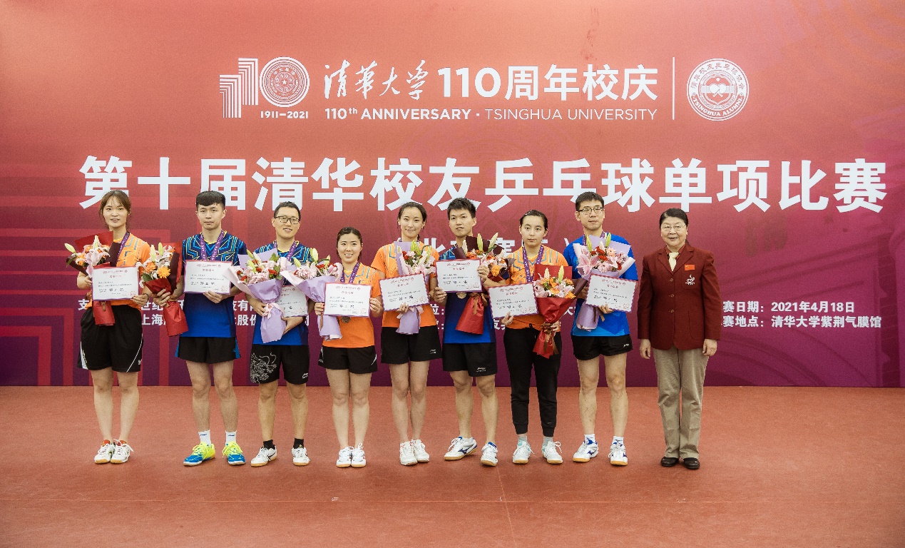 清华校友乒乓球协会副秘书长胡家为为女子单打比赛40岁以下组的优胜者颁奖。获得女子单打比赛40岁以下组冠军的是詹逸思。