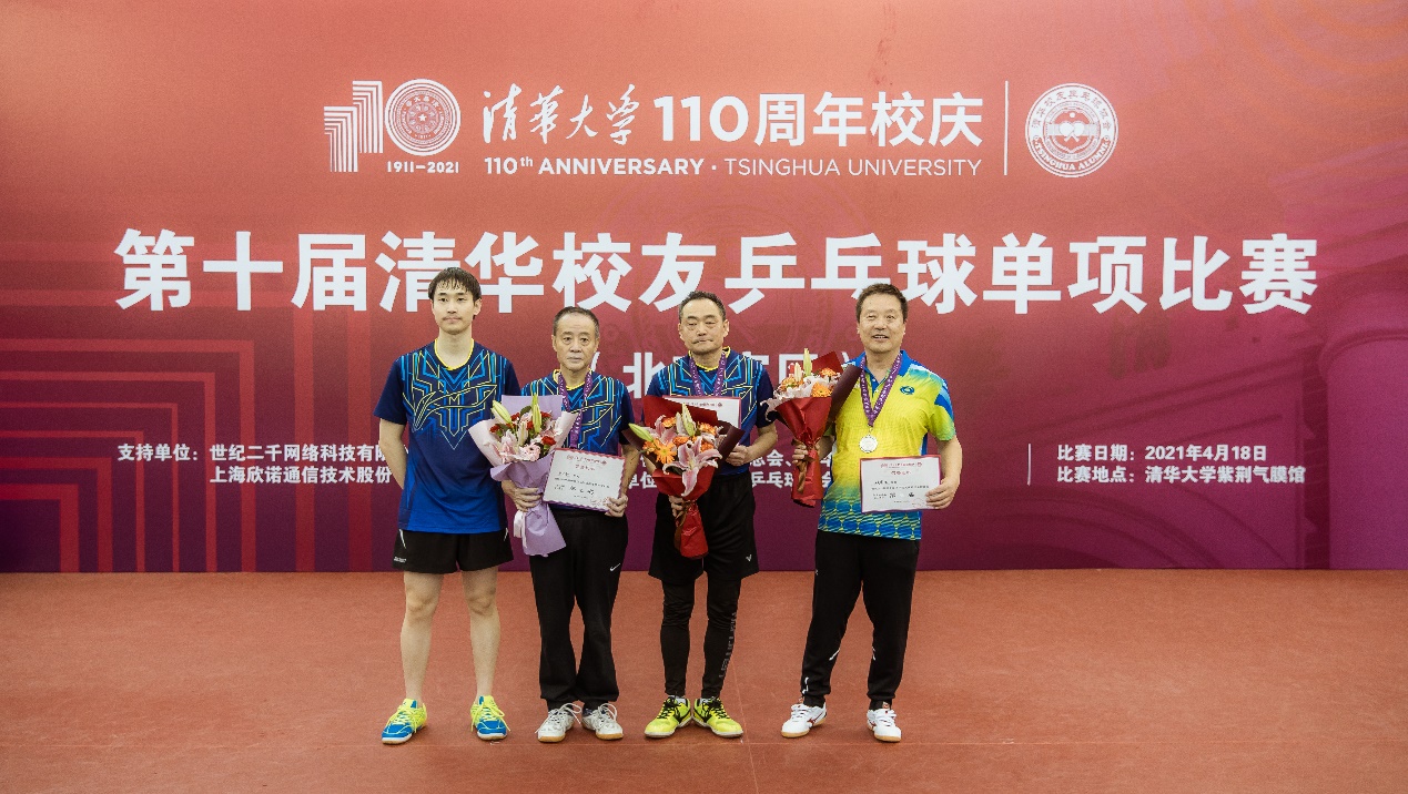 清华校友乒乓球协会副会长王正为男子双打比赛总年龄90岁以上组(含90岁)的优胜者颁奖。获得男子双打比赛总年龄90岁以上组(含90岁)冠军的是刘瑛岩/吴云辉。