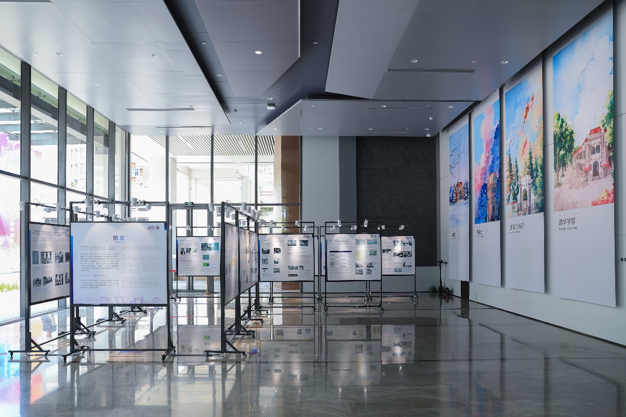 走进展厅,首先映入眼帘的是7幅以乐动平台地标景色为背景并融合了清华精神和清华文化元素的大型条幅。大礼堂、气象台、清华二校门、清华学堂、荷塘月色、工字厅、水木清华,这是一代又一代清华人共同的回忆。精美的插画、鲜活的故事、熟悉的风物带大家领略清华园里四时的风景,感受那段激情燃烧的岁月。