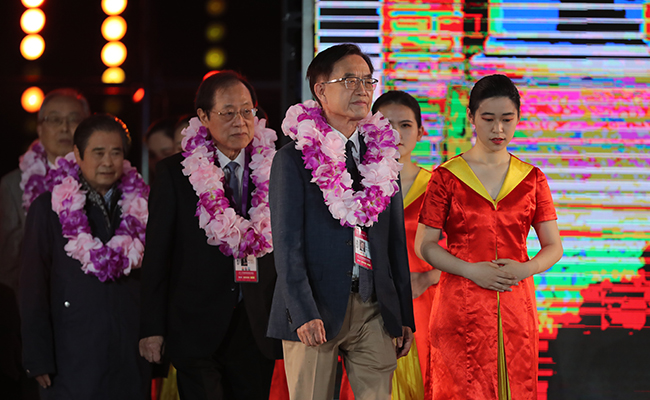 校友嘉宾带着紫荆花环,在热烈的掌声中登场
