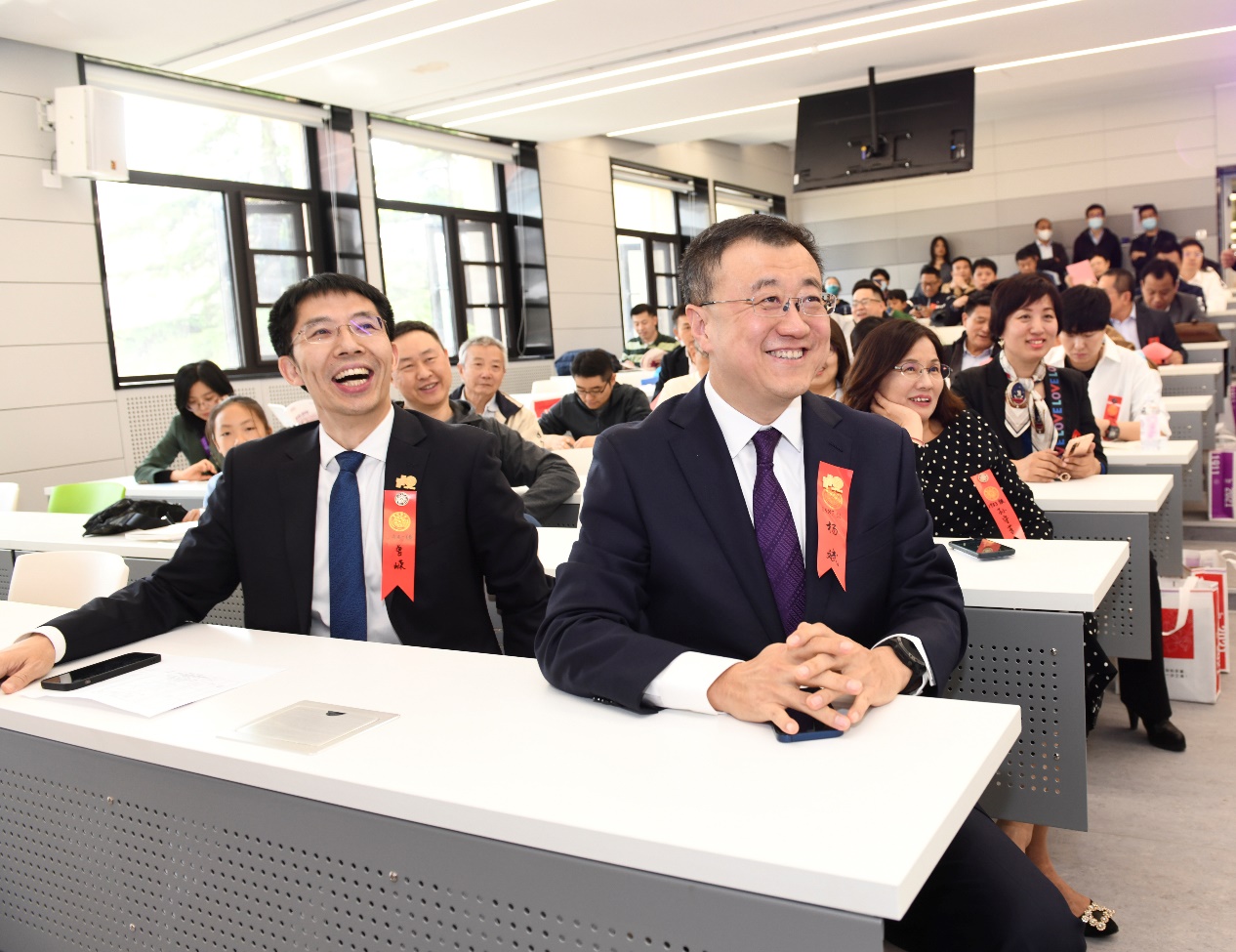 杨斌在致辞中首先回顾了三年前捐赠项目启动时的场景。校友们怀着为母校作贡献,为学弟学妹作表率,同时也为自己留住美好记忆的心情,参与到教室改建捐赠项目中来。为此,他衷心向为学校基础设施建设、校园精神传承作出贡献的各位校友表示感谢。杨斌表示,教室基础设施的改进有力地推动了学校的教育改革事业。例如,精简教室座位与精细化小班教学相辅相成,教室中间的电子屏幕方便了远程课堂的开展,座椅的移动方式改善了课堂教学模式,讲台阶梯的取消拉近师生的距离,新风系统、PM2.5检测装置的安装体现了绿色环保的理念……杨斌特别提到,教室捐赠铭牌上的留言记录了校友隽永的母校情,对学弟学妹也有潜移默化的教育作用。