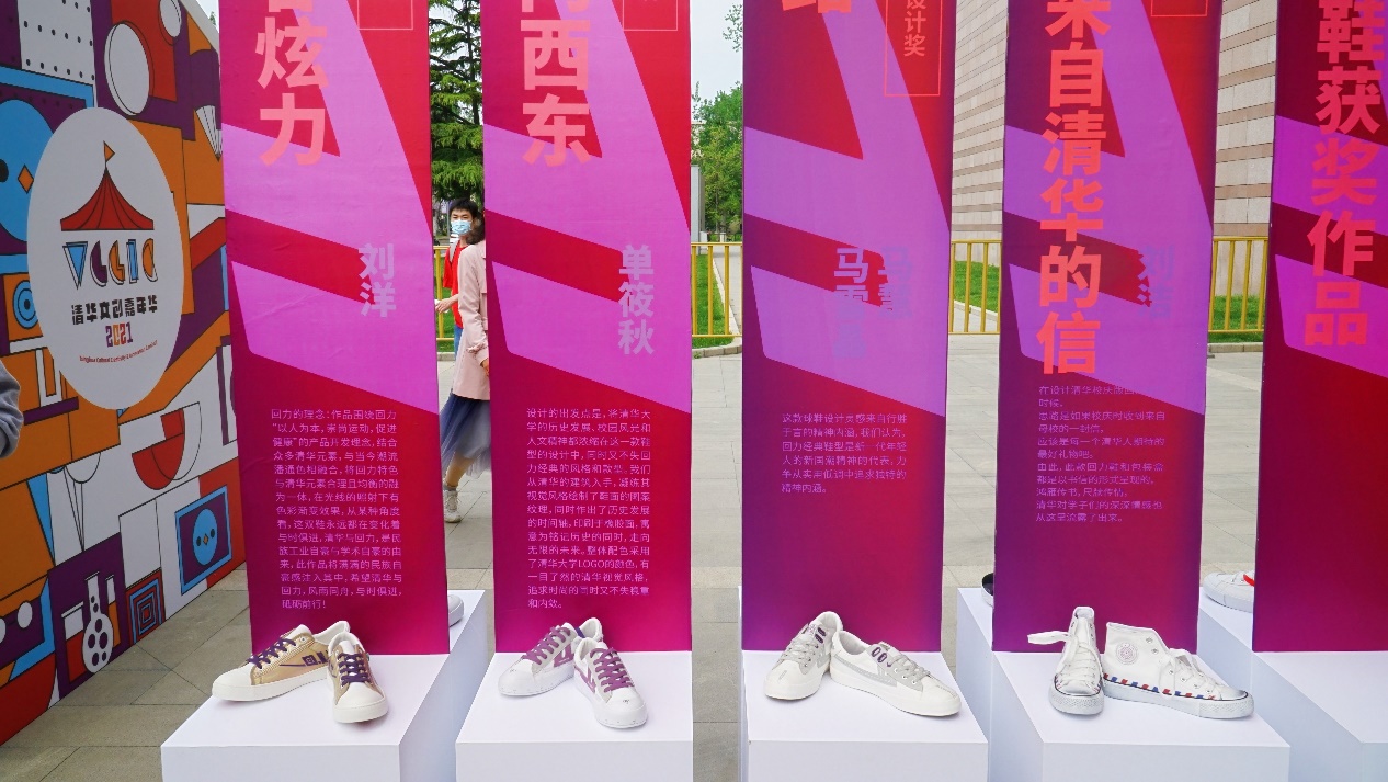 清华文创嘉年华回力鞋专题展开幕式现场同时展出了第五届清华校友“三创大赛”之乐动平台110周年校庆纪念款回力鞋专题赛的部分作品。作品一经推出就受到了师生、校友以及社会各界人士的欢迎,也让校友文创成果成为一道靓丽的风景线。