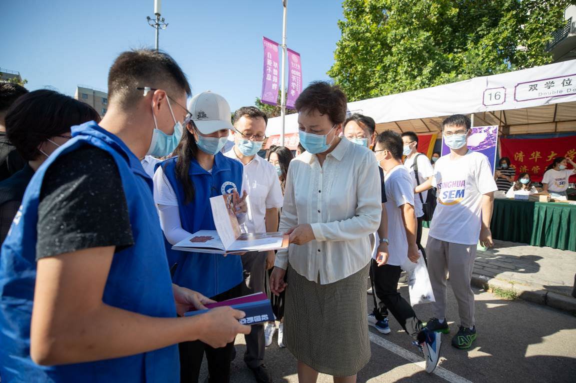 在紫荆路“热烈欢迎新同学”的彩虹门内,各招生大类的迎新报到点布置醒目,一字排开。陈旭一行先后到医学类、数理类、经管学院、电子信息类、土木类迎新点看望新生及志愿者,并慰问参与迎新工作的师生。在医学类迎新点,陈旭与新生骨干营的同学们亲切交流。其中,朱珍葉是一名来自武汉的新生,受父母职业的影响,就读于临床医学(协和)专业。陈旭说,对于同学们来说,今年是特殊的一年,大家经历了在疫情期间备战高考的锻炼,克服了很多困难,也收获了了思考和成长,相信大家会在清华得到更多的培养,实现更好的发展。同时,也希望新生骨干在今后的学习生活中能成为集体建设的骨干力量,和同学们共同成长。