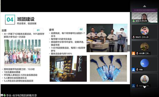 工物系核62班以“理工结合,又红又专”为线索介绍了班级四年来在思想建设、职业规划方面取得的成绩、经验和心得。他们注重思想引领,积极开展各类专业和爱国主义社会实践与党团活动,累计参加社会实践140多次,赴梁家河重走总书记初心之路,调研“天眼”FAST台址、新疆马兰基地等,学习核行业前沿进展,增长专业才干,增强政治素质。所有同学选择本科毕业后在国家重点科研领域工作或深造,为祖国的安全和发展贡献自己的力量。疫情期间,他们的科研也未曾停下脚步。