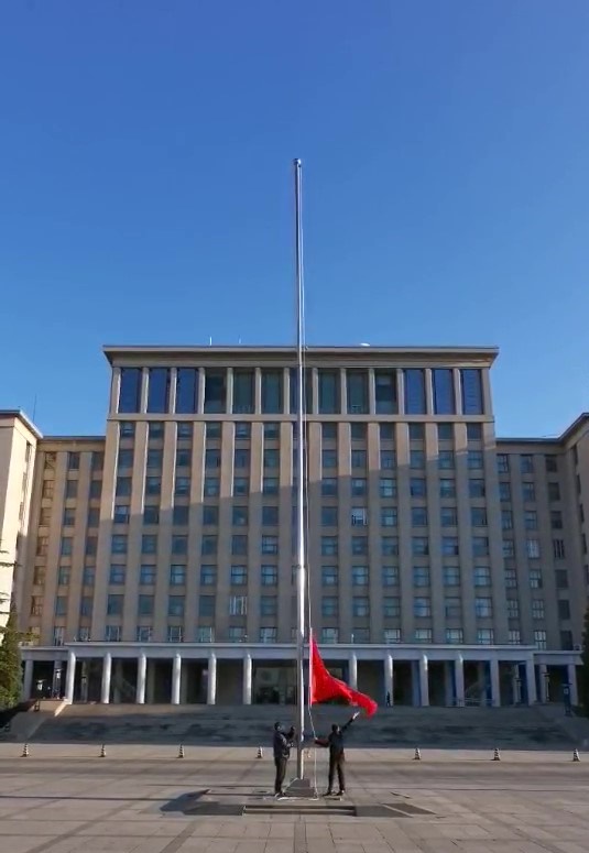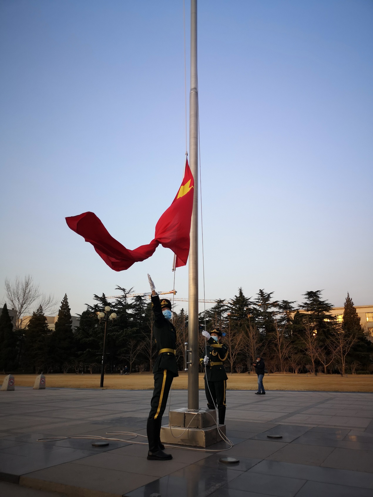 2月17日6点,三位同学早早赶到主楼,进行最后的准备和练习。6点45分,三名同学从主楼出发,行进至旗台,伴随着高亢激昂的国歌,将五星红旗冉冉升起。在全校在线开课的第一天,国旗照常升起。“虽然因为特殊情况,今年只有我们三个人,但仪式的意义是不减的。我们希望通过这样的行动,展现爱国奉献、追求卓越的清华精神。”经求是在升旗仪式后说,“请同学们放心,在园子里的几位同学一定会像往常一样守护好国旗。”