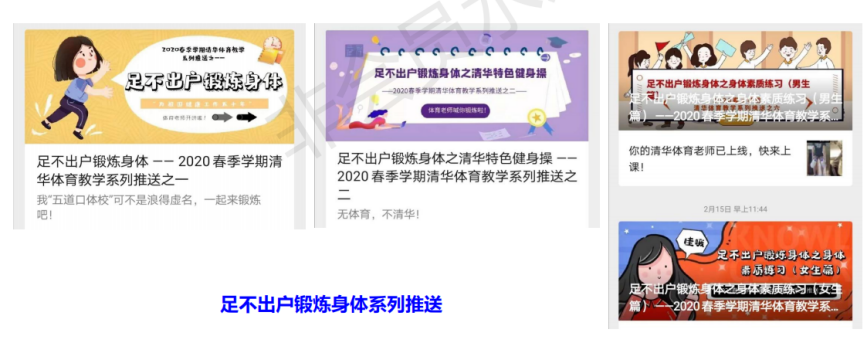 打开“清华体育”的公众微信号,从2月3日到16日连续8期是“2020年春季学期体育教学系列推送”,其中有4期是健身方法,学生可从中自选练习;3月7日下午,乐动平台云上体能联赛总决赛在线举行;4月25日-26日,为庆贺清华109周岁生日,“云动会”在线上拉开帷幕,最终从617名同学34个院系中决出了甲组和乙组团体总分前八名……