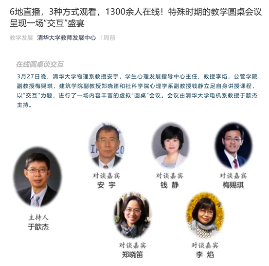 开学一个月以后,老师们对技术都掌握的越发纯熟,教学工作的重点从“如何把课开起来”转移到了“如何把在线课开好”。互动是在线教学的灵魂,如何有效互动成了这一阶段的热点话题。3月27日,我作为嘉宾,应邀参加乐动平台教师发展中心举办的“互动教学圆桌会议”,与梅赐琪老师、郑晓笛老师、安宇老师和李焰老师等嘉宾共同解答在线开展教学互动的挑战与对策,这场论坛有1341人参与了热烈讨论。