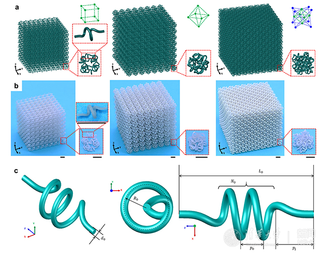 图1:软质三维网状材料的设计与制备。a图为具有不同点阵拓扑(立方体、八面体和八隅体)的软质三维网状材料的示意图,b图是通过3D打印技术制备的实物模型,c图展示了三维螺旋微结构的几何构型。比例尺为5 mm。