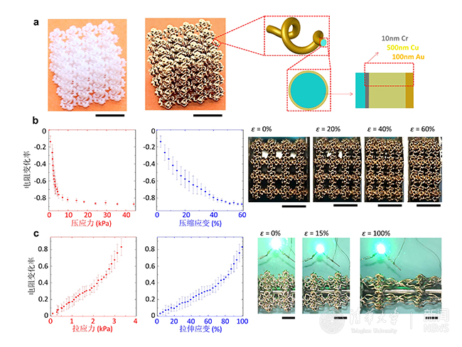 图3:基于仿生软质三维网状材料的柔性传感器。图a为软质三维网状材料在磁控溅射前后的对比图,图b为柔性传感器压缩变形时的电阻变化率变化曲线以及变形过程图,图c为柔性传感器拉伸变形时的电阻变化率变化曲线以及变形过程图。比例尺为5 mm。